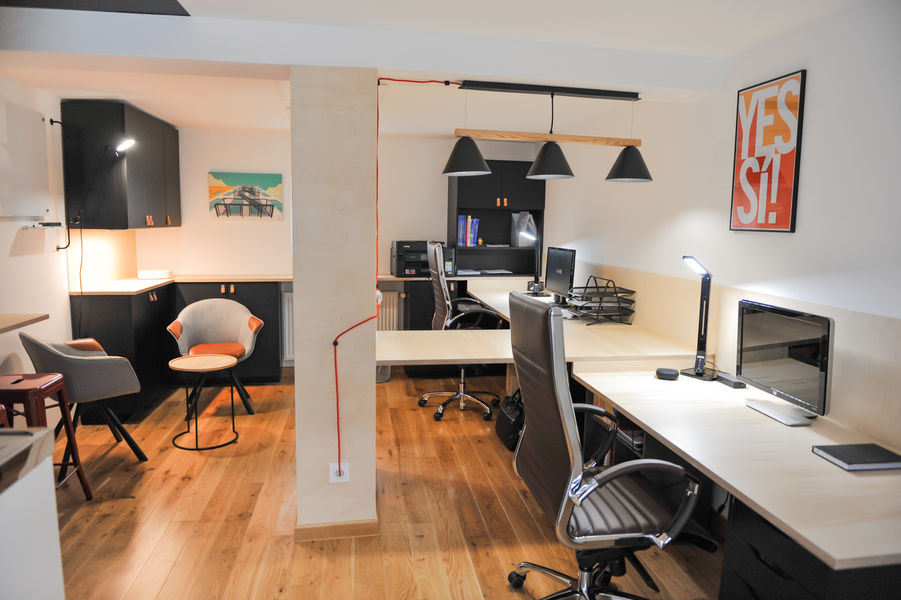 C'est donc une composition totalement sur-mesure qui a vu le jour pour répondre à plusieurs exigences : avoir au moins 2 bureaux, du rangement ouvert et fermé, un espace fauteuils pour recevoir des clients de façon moins formelle.