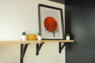 L'espace cuisine : une table haute, assortie de 2 tabourets installés le long du mur, donne la possibilité de déjeuner sur un espace dédié. Une étagère au dessus de la kitchenette existante quand à elle donne la possibilité d'installer un appareil de chauffe ainsi qu'une cafetière/bouilloire.